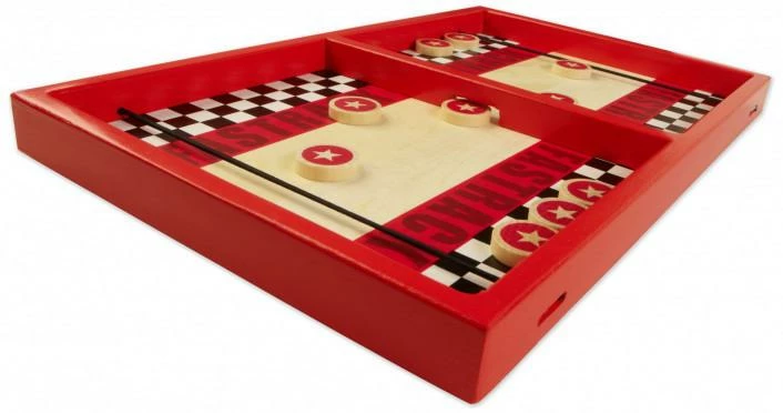 Fastrack is a new kind of sports game. Part hockey, part archery, it‰۪s sure to produce rapid action and loads of fun. The game consists of a wooden tray with an elastic band across each end and a bridge in the middle with a slot opening. Each side starts with 5 wooden discs. Using only one hand and the elastic band, players shoot the discs across to the other side. The first to successfully clear all 10 to the opponent‰۪s side wins the round. While skill is essential to come out on top, so is luck because the disks can bounce off each other or bounce off your opponent‰۪s elastic and right back to your side. It‰۪s a fast-paced frenzy! You better ride the fine line between speed and accuracy to win. Fastrack is high quality, durable, and made of wood. The retro racing checkerboard motif revs up the fun!