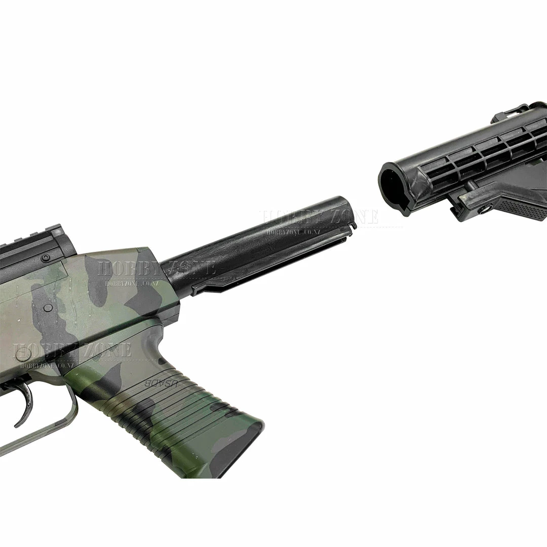 - Buttstock that you can slide backwards so you can slot the battery in.