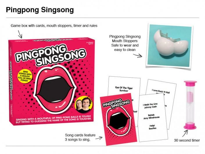Ping Pong Sing Song, a name that rolls off the tongue! Add the mouthguard into your, take a card, choose the song, then battle with your opponent. Can the audience guess what you are singing and win the card? It‰۪s Speak out version 2.0, without the horrible dribbling and showing bad dental hygieneåÊåÊ